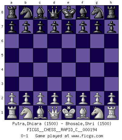 Last move : 0-1 2018 November 30 11:56:27 [Event "FICGS__CHESS__RAPID_C__000194"] [Site "FICGS"] [Date "2018.10.31"] [Round "1"] [White "Putra,Dhiara"] [Black "Bhosale,Shri"] [Result "0-1"] [WhiteElo "1500"] [BlackElo "1500"] 0-1 This chess game has been lost on time (started : 2018.10.31 8:0:43) Player Black won this chess game. Follow this game move after move (download)Chess is above all, a fight ! (Emanuel Lasker) Schachspieler können ausgezeichnet Varianten am Schachbrett berechnen, aber nicht im realen Leben. Zu stark ist der Individualismus im Schach ausgeprägt, und für viele ist ein kleiner momentaner persönlicher Vorteil wichtiger als ein weit größerer Vorteil von morgen. (Anatoly Karpov) Los Peones son nacidos libres, y aún así, se encuentran encadenados por todos lados. (Rick Kennedy) Donnez-moi un Cavalier en 6e et je gagnerais toutes mes parties. (Steinitz) A specialist learns more and more about less and less until he knows everything about nothing. (Nicholas Murray Butler)