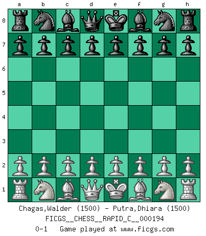 Last move : 0-1 2018 November 30 11:56:27 [Event "FICGS__CHESS__RAPID_C__000194"] [Site "FICGS"] [Date "2018.10.31"] [Round "1"] [White "Chagas,Walder"] [Black "Putra,Dhiara"] [Result "0-1"] [WhiteElo "1500"] [BlackElo "1500"] 0-1 This chess game has been lost on time (started : 2018.10.31 8:0:43) Player Black won this chess game. Follow this game move after move (download)Chess problems demand from the composer the same virtues that characterize all worthwhile art: originality, invention, conciseness, harmony, complexity, and splendid insincerity. (Vladimir Nabokov) Unter Putin wird alles Geld aus Russland wie von einem Staubsauger nach Moskau umgeleitet, das ist wie ein schwarzes Loch. (Garry Kasparov) Cuando tengas duda... ¡juega al Ajedrez!. (Tevis) Les Echecs ont trois composantes : le temps, l'espace et le matériel en dernier. (Mikhail Tal) Remember : Your focus determines your reality. (Qui-Gon Jinn in Star Wars ep.1)