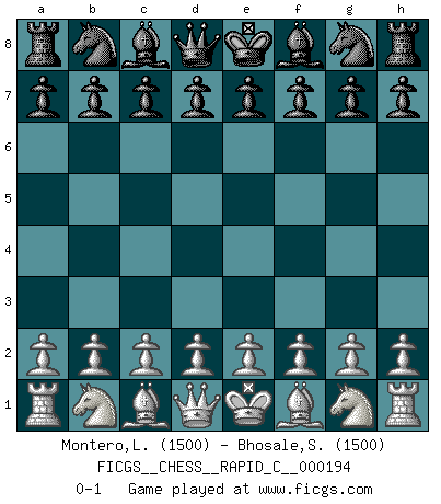 Last move : 0-1 2018 November 30 11:56:27 [Event "FICGS__CHESS__RAPID_C__000194"] [Site "FICGS"] [Date "2018.10.31"] [Round "1"] [White "Montero,Luis Fernando"] [Black "Bhosale,Shri"] [Result "0-1"] [WhiteElo "1500"] [BlackElo "1500"] 0-1 This chess game has been lost on time (started : 2018.10.31 8:0:43) Player Black won this chess game. Follow this game move after move (download)When you absolutely don't know what to do anymore, it is time to panic. (John van der Wiel) Schach ist das schnellste Spiel der Welt, weil man in jeder Sekunde Tausende von Gedanken ordnen muß. (Albert Einstein) Muchos se han convertido en Maestros de Ajedrez, nadie se ha convertido en el Maestro del Ajedrez. (Siegbert Tarrasch) Si le désir cupide (et stupide) de gagner est une inépuisable source de souffrance, une combinaison brillante sur l'échiquier est une découverte : le coquelicot qui s'épanouit lorsque apparaît la Voie Lactée. (Arrabal) When a man with money meets a man with experience, the man with experience leaves with money and the man with money leaves with experience. (Anonymous)