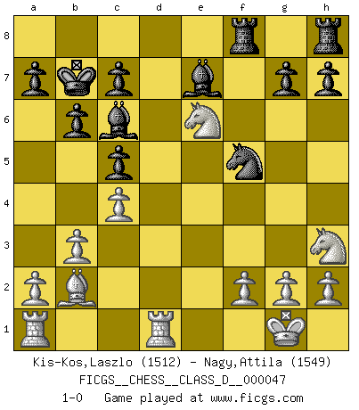 Last move : 1-0 2007 September 25 3:51:57 [Event "FICGS__CHESS__CLASS_D__000047"] [Site "FICGS"] [Date "2007.05.23"] [Round "1"] [White "Kis-Kos,Laszlo"] [Black "Nagy,Attila"] [Result "1-0"] [WhiteElo "1512"] [BlackElo "1549"] 1.e4 e5 2.Nf3 Nc6 3.Bb5 Nf6 4.O-O Nxe4 5.d4 Nd6 6.Bxc6 dxc6 7.dxe5 Nf5 8.Qxd8+ Kxd8 9.Nc3 Bd7 10.Rd1 Kc8 11.Ng5 Be8 12.b3 b6 13.Bb2 Be7 14.Nce4 Kb7 15.c4 c5 16.Nh3 Bc6 17.Neg5 Raf8 18.e6 fxe6 19.Nxe6 1-0 This chess game has been lost on time (started : 2007.05.23 14:20:7) Ruy Lopez : Berlin defense, Open variation Kingside Castling by player White (move 4) Player White won this chess game. Follow this game move after move (download)When I asked Fischer why he had not played a certain move in our game, he replied: 'Well, you laughed when I wrote it down !' (Mikhail Tal) Ein Springer auf f6 gegen die eigene Rochadestellung ist schlimmer als ein rostiger Nagel im Knie. (Efim Bogoljubov) El Ajedrez es una guerra en un tablero. El objetivo es aplastar la mente del oponente. (Bobby Fischer) A chaque perte on perd un peu de soi. (Joël Lautier) Computer Science is no more about computers than astronomy is about telescopes. (Edsger W. Dijkstra)