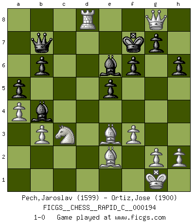Last move : 1-0 2019 March 26 1:39:29 [Event "FICGS__CHESS__RAPID_C__000194"] [Site "FICGS"] [Date "2018.10.31"] [Round "1"] [White "Pech,Jaroslav"] [Black "Ortiz,Jose"] [Result "1-0"] [WhiteElo "1599"] [BlackElo "1900"] 1.c4 c5 2.Nc3 d6 3.Nf3 Nc6 4.d4 cxd4 5.Nxd4 Nxd4 6.Qxd4 e5 7.Qd3 Nf6 8.e4 a6 9.Be2 Be7 10.O-O O-O 11.b3 Bd7 12.a4 a5 13.Be3 h6 14.Rfd1 Be6 15.Rd2 Qc7 16.Rad1 Rad8 17.Qb1 b6 18.Nb5 Qb7 19.f3 d5 20.cxd5 Nxd5 21.exd5 Bxd5 22.Nc3 Be6 23.Rxd8 Bb4 24.Rxf8+ Kxf8 25.Qh7 f6 26.Rd8+ Kf7 27.Qg8+ 1-0 English : Symmetrical variation Kingside Castling by player White (move 10) Kingside Castling by player Black (move 10) Player White won this chess game. Follow this game move after move (download)A chess genius has died; a loss for humanity. (Viktor Kortchnoi, about Bobby Fischer's death) Mein Gehirn das ist mein zweitwichtigstes Organ [Aus dem Film: Der Schläfer]. (Woody Allen) La maestría del Ajedrez consiste esencialmente en analizar posiciónes de Ajedrez con precisión. (Mikhail Botvinnik) Toutes les manuvres exécutées sur une colonne ouverte ont pour but ultime l'intrusion définitive sur la septième ou la huitième rangée, en plein cur de la position ennemie. (Aaron Nimzovitch) Life is like internet, nothing interesting, but noone want to leave it. (Ilmars Cirulis)