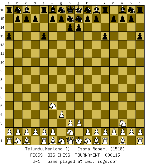 Last move : 0-1 2018 December 10 12:57:41 [Event "FICGS__BIG_CHESS__TOURNAMENT__000115"] [Site "FICGS"] [Date "2018.10.31"] [Round "1"] [White "Tatundu,Martono"] [Black "Csoma,Robert"] [Result "0-1"] [WhiteElo ""] [BlackElo "1518"] 1.g2-g4 q15-q13 2.j2-h4 m15-m13 3.p1-o3 e15-e13 4.h4-f5 a15-a13 0-1 This big chess game has been lost on time (started : 2018.10.31 10:58:43) Follow this game move after move (download)During a Chess competition a Chessmaster should be a combination of a beast of prey and a monk. (Alexander Alekhine) Offensichtlich kennt Kasparow nichts anderes als Schach, und ich könnte 500 weitere Spieler dieser Sorte benennen. (Judith Polgar) Fischer sacrificó virtualmente todo lo que la mayoría de nosotros los 'debiles' (término que él usa) valoramos, respetamos y apreciamos por el amor de un astuto, a menudo hermoso tablero de juego, por el privilegio ambivalente de ser su mas grande maestro. (Paul Kollar) Les Echecs représentent une sphère d'idées créatrices basée sur la volonté des deux protagonistes. (Smyslov) Hold em is to stud what chess is to checkers. (Johnny Moss)