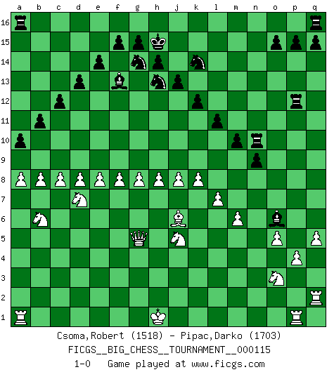 Last move : 1-0 2019 January 31 17:14:11 [Event "FICGS__BIG_CHESS__TOURNAMENT__000115"] [Site "FICGS"] [Date "2018.10.31"] [Round "1"] [White "Csoma,Robert"] [Black "Pipac,Darko"] [Result "1-0"] [WhiteElo "1518"] [BlackElo "1703"] 1.a2-a4 h15-g13 2.e2-e4 j15-k13 3.m2-m4 g16-f14 4.q2-q4 k16-l14 5.c2-c3 b15-b14 6.b2-b4 c16-b15 7.o2-o3 e15-e14 8.d2-d4 f16-b12 9.f2-f4 b16-a14 10.g2-g4 n15-n13 11.h3-h4 m15-m13 12.j3-j4 p16-o14 13.k2-k4 a14-c13 14.l2-l4 c13-e12 15.n2-n4 a15-a13 16.o3-o4 l16-p12 17.p2-p4 g13-h11 18.b1-a3 h16-m12 19.c1-d2 k13-j11 20.f1-h3 e12-f10 21.g1-f3 b15-n4 22.q1-q2 j16-h15 23.c3-c4 j11-h9 24.k1-l3 n4-k7 25.h1-g2 m12-n11 26.q2-n2 n11-l9 27.n2-q2 h11-g9 28.o1-n2 g9-e8 29.l1-j3 h9-g7 30.a4-a5 f10-g8 31.b4-b5 l9-a9 32.a5-a6 g8-j7 33.c4-c5 j7-g8 34.e4-e5 a9-a8 35.f4-f5 e8-c7 36.h4-h5 g7-e8 37.g4-g5 g8-e7 38.k4-k5 e7-d5 39.l4-l5 k7-l8 40.m4-m5 p12-o13 41.o4-o5 a8-b9 42.f5-f6 o13-f5 43.h3-f5 b9-f5 44.j2-g3 d5-f4 45.d2-f4 b12-l3 46.j1-h1 f5-f4 47.e1-e4 f4-e4 48.g3-e4 c7-d5 49.b5-b6 e8-c9 50.p1-o3 l3-q8 51.q4-q5 c15-c14 52.a3-c4 b14-b13 53.n2-l4 a13-a12 54.a6-a7 d15-d13 55.c5-c6 d5-b4 56.c6-c7 c14-c13 57.e5-e6 c13-c12 58.g5-g6 b13-b12 59.h5-h6 b12-b11 60.j4-j5 a12-a11 61.h2-k3 a11-a10 62.j5-j6 o16-l13 63.k5-k6 b4-d5 64.l5-l6 d5-f4 65.g2-g5 f4-h3 66.g5-h4 h3-k2 67.j3-k2 q8-k2 68.h4-k2 f14-h13 69.m5-m6 c9-b7 70.d4-d5 b7-c5 71.e4-c5 l13-c5 72.f3-e5 l8-f13 73.k2-g5 n13-n12 74.k3-j5 l14-j13 75.a7-a8 l15-l14 76.b6-b7 c5-j11 77.d5-d6 k15-k13 78.d6-d7 l14-l13 79.e6-e7 l13-l12 80.f6-f7 m13-m12 81.g6-g7 n12-n11 82.h6-h7 n11-n10 83.b7-b8 m12-m11 84.j6-j7 m16-m12 85.k6-k7 m12-p12 86.m1-p1 j13-g14 87.c4-b6 j14-j13 88.l6-l7 e16-n16 89.c7-c8 k13-k12 90.d7-d8 l12-l11 91.e7-e8 m11-m10 92.f7-f8 n10-n9 93.h7-h8 n16-n12 94.j7-j8 j11-o6 95.g7-g8 o14-m13 96.k7-k8 m13-k14 97.e5-d7 n12-n10 98.l4-j6 1-0 Follow this game move after move (download)In Chess, just as in life, today's bliss may be tomorrow's poison. (Assaic) Es ist im Leben wie im Schachspiel. Wir entwerfen einen Plan, dieser bleibt jedoch bedingt durch das, was im Schachspiel dem Gegner, im Leben dem Schicksal zu tun belieben wird. (Arthur Schopenhauer) Con el tiempo, empecé a progresar en partidas decisivas. Tal vez porque me di cuenta de una simple verdad: no solo estaba yo nervioso sino también mi oponente. (Mikhail Tal) Les Echecs ont trois composantes : le temps, l'espace et le matériel en dernier. (Mikhail Tal) Patience, use the Force, think ! (Obi-Wan Kenobi in Star Wars ep.2)