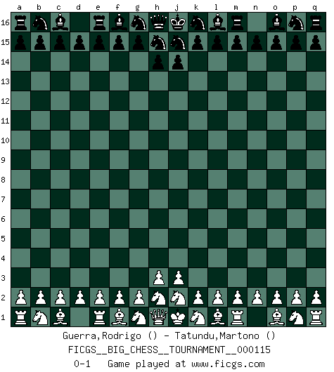 Last move : 0-1 2018 November 30 11:56:27 [Event "FICGS__BIG_CHESS__TOURNAMENT__000115"] [Site "FICGS"] [Date "2018.10.31"] [Round "1"] [White "Guerra,Rodrigo"] [Black "Tatundu,Martono"] [Result "0-1"] [WhiteElo ""] [BlackElo ""] 0-1 This big chess game has been lost on time (started : 2018.10.31 10:58:43) Follow this game move after move (download)All I want to do, ever, is just play Chess. (Bobby Fischer) Wie, soll nun auch die Opposition abgeschafft werden? Ja, es tut mir leid, Ihnen diesen Schmerz nicht ersparen zu können. (Aaron Nimzowitsch) Las combinaciones han sido siempre el aspecto más intrigante del Ajedrez. Los Maestros las buscan, el público las aplauden, los críticos las alaban. La razón se debe a que las combinaciones hacen posible que el Ajedrez sea más que un ejercicio matemático con una carencia de vida. Ellas son la poesía del juego, son del Ajedrez lo que la melodía es de la música. Ellas representan el triunfo de la mente sobre la materia. (Reuben Fine) J'ai vu le vaincu d'Echecs jouer des années durant dans l'espoir de la fête de la victoire. Car tu es plus riche de ce qu'elle existe si même elle n'est point pour toi. Ainsi de la perle du fond des mers. (Antoine de Saint-Exupéry) I know the human being and fish can coexist peacefully. (George W. Bush, Saginaw sept. 29, 2000)