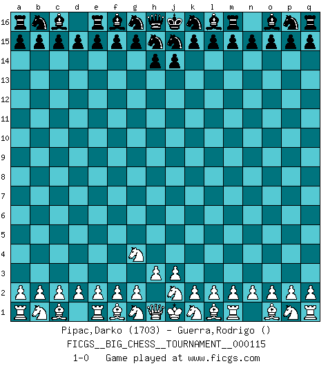 Last move : 1-0 2018 November 30 23:59:28 [Event "FICGS__BIG_CHESS__TOURNAMENT__000115"] [Site "FICGS"] [Date "2018.10.31"] [Round "1"] [White "Pipac,Darko"] [Black "Guerra,Rodrigo"] [Result "1-0"] [WhiteElo "1703"] [BlackElo ""] 1.h2-g4 1-0 This big chess game has been lost on time (started : 2018.10.31 10:58:43) Follow this game move after move (download)By this measure (on the gap between Fischer & his contemporaries), I consider him the greatest world champion. (Garry Kasparov) Stelle das Brett so, daß die Sonne in die Augen deines Gegners scheint. (Ruy López) Yo tuve un dolor de muelas en la primer partida. En el segundo juego, tuve un dolor de cabeza. En el tercero, tuve un ataque de reumatísmo. En la cuarta partida, no me sentía muy bien. ¿Y en el quinto juego? Bueno, ¿que acaso uno tiene que ganar todos los juegos?. (Siegbert Tarrasch) On a dit que l'homme se distingue de l'animal par le fait qu'il achète plus de livres qu'il ne peut en lire. Je voudrais suggérer qu'inclure à la liste des livres quelques livres d'échecs rendrait la distinction manifeste. (Edward Lasker) 98% of all statistics are made up. (Author unknown)