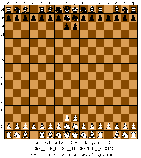 Last move : 0-1 2018 November 30 11:56:27 [Event "FICGS__BIG_CHESS__TOURNAMENT__000115"] [Site "FICGS"] [Date "2018.10.31"] [Round "1"] [White "Guerra,Rodrigo"] [Black "Ortiz,Jose"] [Result "0-1"] [WhiteElo ""] [BlackElo ""] 0-1 This big chess game has been lost on time (started : 2018.10.31 10:58:43) Follow this game move after move (download)It is difficult to play against Einstein's theory --on his first loss to Fischer. (Mikhail Tal) Der Schachmeister von Heute braucht Courage, einen Killerinstinkt, Ausdauer und Arroganz. (Larry Evans) Un entendimiento a fondo de las continuaciones típicas del mate, hace de las combinaciones de sacrificio mas complicadas conducirlas a ellas no solo sin dificultad, sino casi de una manera natural. (Siegbert Tarrasch) Je ne suis pas le dernier à jouer lâchement des coups douteux pendant le zeïtnot de l'adversaire pour l'achever: en effet les coups qui font le plus peur sont ceux que l'on ne comprend pas. Je me fais souvent peur quand je joue. (Un professeur anonyme) It is not enough to be a good player... you must also play well. (Siegbert Tarrasch)