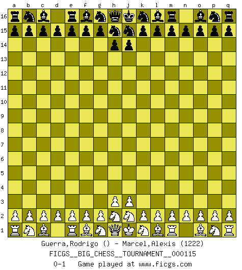 Last move : 0-1 2018 November 30 11:56:27 [Event "FICGS__BIG_CHESS__TOURNAMENT__000115"] [Site "FICGS"] [Date "2018.10.31"] [Round "1"] [White "Guerra,Rodrigo"] [Black "Marcel,Alexis"] [Result "0-1"] [WhiteElo ""] [BlackElo "1222"] 0-1 This big chess game has been lost on time (started : 2018.10.31 10:58:43) Follow this game move after move (download)He who takes the Queen's Knight's Pawn will sleep in the streets. (Anonymous) Wenn Du absolut nicht mehr weißt, was Du tun sollst, dann ist es Zeit für Panik. (John van der Wiel) Siempre es mucho mejor sacrificar las piezas de tu oponente. (Savielly Tartakover) Horreur, mais aussi harmonie suprême : qu'y avait-il en effet au monde en dehors des échecs ? Le brouillard, l'inconnu, le non-être... (Vladimir Nabokov) Lamb in skin of tiger, still fears the wolf. (Chinese proverb)