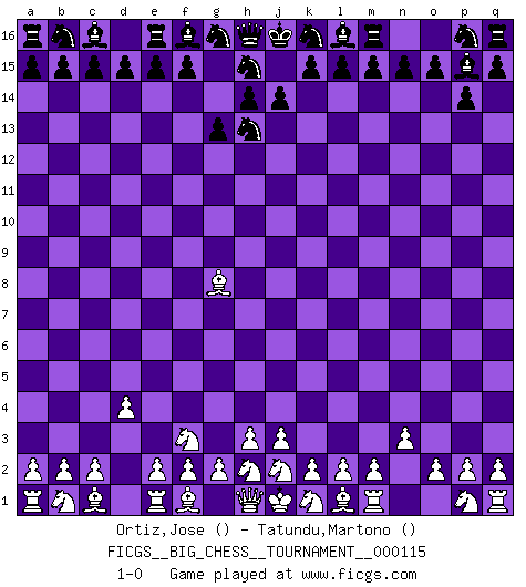 Last move : 1-0 2018 December 10 0:55:57 [Event "FICGS__BIG_CHESS__TOURNAMENT__000115"] [Site "FICGS"] [Date "2018.10.31"] [Round "1"] [White "Ortiz,Jose"] [Black "Tatundu,Martono"] [Result "1-0"] [WhiteElo ""] [BlackElo ""] 1.n2-n3 g15-g13 2.d2-d4 p15-p14 3.o1-k5 o16-p15 4.g1-f3 j15-h13 5.k5-g8 1-0 This big chess game has been lost on time (started : 2018.10.31 10:58:43) Follow this game move after move (download)I like the moment when I break a man's ego. (Bobby Fischer) Wenn Du nicht kämpfst, um anderen etwas zu beweisen, sondern nur für Dich selbst, dann bist du fast unbesiegbar. (Garry Kasparov) El Ajedrez es una manera fabulosa para que los niños aprendan a autovalorarse y a autoestimarse. (Saudin Robovic) Tous ces prétendus hommes politiques sont les pions, les Cavaliers, les Tours ou les Fous d'une partie d'échecs qui se jouera tant qu'un hasard ne renversera pas l'échiquier. (Honoré de Balzac) I just play for fun. (Anna Kournikova)