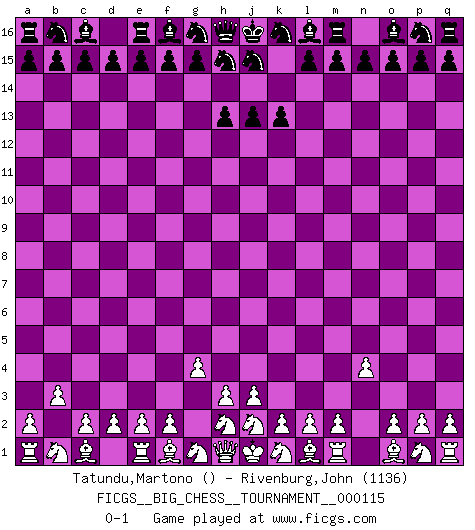 Last move : 0-1 2018 December 17 14:6:52 [Event "FICGS__BIG_CHESS__TOURNAMENT__000115"] [Site "FICGS"] [Date "2018.10.31"] [Round "1"] [White "Tatundu,Martono"] [Black "Rivenburg,John"] [Result "0-1"] [WhiteElo ""] [BlackElo "1136"] 1.g2-g4 h14-h13 2.b2-b3 j14-j13 3.n2-n4 k15-k13 0-1 This big chess game has been lost on time (started : 2018.10.31 10:58:43) Follow this game move after move (download)Chess teaches you to control the initial excitement you feel when you see something that looks good and it trains you to think objectively when you're in trouble. (Stanley Kubrick) Man wirke der falschen Auffassung entgegen, als ob jeder Zug Unmittelbares zu leisten habe; auch Werte- und Ruhezüge haben ihre Existenzberechtigung. (Aaron Nimzowitsch) No puedes jugar al Ajedrez si eres de corazón noble. (Proverbio Francés) Aidez vos pièces, elles vous aideront. (Paul Morphy) We cannot be sure of having something to live for unless we are willing to die for it. (Ernesto Che Guevara)