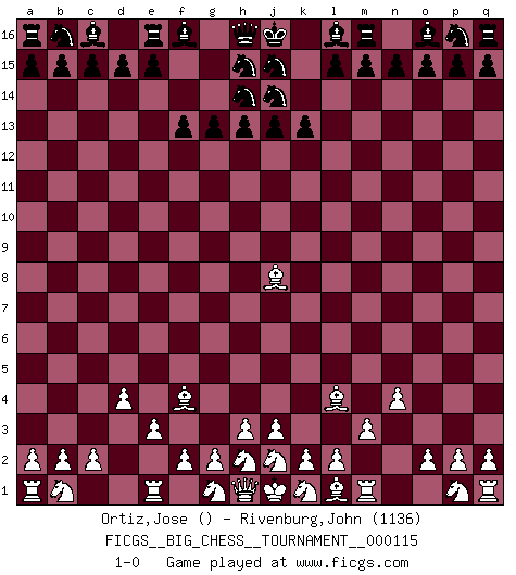 Last move : 1-0 2018 December 21 14:19:28 [Event "FICGS__BIG_CHESS__TOURNAMENT__000115"] [Site "FICGS"] [Date "2018.10.31"] [Round "1"] [White "Ortiz,Jose"] [Black "Rivenburg,John"] [Result "1-0"] [WhiteElo ""] [BlackElo "1136"] 1.d2-d4 g15-g13 2.c1-f4 f15-f13 3.e2-e3 h14-h13 4.f1-d3 j14-j13 5.n2-n4 g16-h14 6.o1-l4 k16-j14 7.d3-j8 k15-k13 8.m2-m3 1-0 This big chess game has been lost on time (started : 2018.10.31 10:58:43) Follow this game move after move (download)A bad plan is better than none at all. (Frank Marshall) Oft bringt ein stiller Zug das Erdbeben. (Richard Reti) Todo se encuentra en un estado de flujo y esto incluye al mundo del Ajedrez. (Mikhail Botvinnik) Un journaliste : 'Vous préférez avoir une dame de plus sur l'échiquier ou au lit ?' Boris Spassky : 'Ca dépend de la position.' Panic is a sudden desertion of us, an a going over to the enemy of our imagination. (Christian Nevell Bovee)
