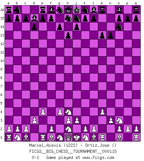 Last move : 0-1 2018 November 12 7:2:9 [Event "FICGS__BIG_CHESS__TOURNAMENT__000115"] [Site "FICGS"] [Date "2018.10.31"] [Round "1"] [White "Marcel,Alexis"] [Black "Ortiz,Jose"] [Result "0-1"] [WhiteElo "1222"] [BlackElo ""] 1.g2-g4 g15-g14 2.d2-d3 d15-d14 3.n2-n3 n15-n13 4.j2-h4 h14-h13 5.e2-e4 p16-o14 6.m2-m4 c16-d15 7.p1-o3 m15-m13 0-1 Follow this game move after move (download)Chess, like any creative activity, can exist only through the combined efforts of those who have creative talent, and those who have the ability to organize their creative work. (Mikhail Botvinnik) Kein Schachspieler kann gut schlafen. (H. G. Wells) No hay precio que no valga la pena por la cabellera del Rey enemigo. (Koblentz) Les échecs, c'est la lutte contre l'erreur. (Johannes Zukertort) You cannot beat a roulette table unless you steal money from it. (Albert Einstein)