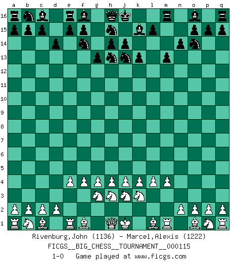 Last move : 1-0 2018 November 21 22:33:3 [Event "FICGS__BIG_CHESS__TOURNAMENT__000115"] [Site "FICGS"] [Date "2018.10.31"] [Round "1"] [White "Rivenburg,John"] [Black "Marcel,Alexis"] [Result "1-0"] [WhiteElo "1136"] [BlackElo "1222"] 1.k2-k4 k15-k13 2.j3-j4 d15-d14 3.h3-h4 n15-n14 4.g2-g4 g15-g13 5.j2-g3 l16-k15 6.g1-h3 p16-o14 7.h2-k3 j15-h13 8.k1-j3 h15-j13 9.l2-l4 k16-h15 10.f2-f4 g16-f14 11.m2-m4 m15-m13 12.e2-e4 1-0 Follow this game move after move (download)Chess is a foolish expedient for making idle people believe they are doing something very clever when they are only wasting their time. (George Bernard Shaw) Ich tröste mich mit dem Vergnügen, daß Schachfans, Zuschauer und Leser glücklich sind, wenn ein Großmeister etwas riskiert, statt nur Klötzchen zu schieben. (Mikhail Nekhemyevich Tal) Un jugador que trata de regresar una movida en el Ajedrez es un futuro carterista. (Richard Fenton) Le pion, dans sa simplicité, marche droit devant lui, mais lorsqu'il prend, il le fait obliquement? Ainsi l'homme, tant qu'il reste pauvre, marche dans la droiture et vit honnêtement, mais lorsqu'il recherche les honneurs, il flatte, se parjure et, par les voies obliques, cherche une position supérieure sur l'échiquier du monde. (Jean de Galles) All art requires courage. (Anne Tucker)