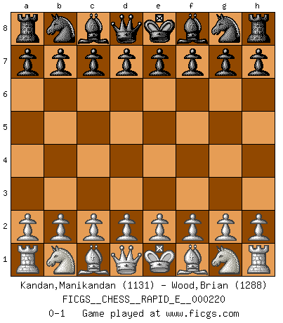 Last move : 0-1 2018 November 30 23:59:28 [Event "FICGS__CHESS__RAPID_E__000220"] [Site "FICGS"] [Date "2018.10.31"] [Round "1"] [White "Kandan,Manikandan"] [Black "Wood,Brian"] [Result "0-1"] [WhiteElo "1131"] [BlackElo "1288"] 0-1 This chess game has been lost on time (started : 2018.10.31 20:28:39) Player Black won this chess game. Follow this game move after move (download)After black's reply to 1.e4 with 1..e5, leaves him always trying to get into the game. (Howard Staunton) Kann Schach nicht schließlich das Nationalspiel der Deutschen werden? Und welche weiteren Ausblicke bieten sich dann dar! Welche Hebung des allgemeinen Kultur-Niveaus, ja der Moral, wenn das Schachbrett den Kartentisch verdrängen würde! Wahrlich, ein Ziel, des Schweißes der Edlen wert! (Siegbert Tarrasch) No es una movida, aún la mejor movida que tu debas buscar, sino un plan comprensible. (Eugene Znosko-Borovsky) A chaque perte on perd un peu de soi. (Joël Lautier) I don't diet. I just don't eat as much as I'd like to. (Linda Evangelista, supermodel)