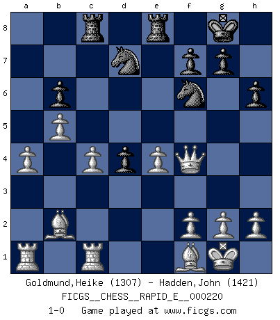Last move : 1-0 2018 November 16 23:31:25 [Event "FICGS__CHESS__RAPID_E__000220"] [Site "FICGS"] [Date "2018.10.31"] [Round "1"] [White "Goldmund,Heike"] [Black "Hadden,John"] [Result "1-0"] [WhiteElo "1307"] [BlackElo "1421"] 1.b4 e5 2.Bb2 d6 3.e3 Nf6 4.c4 Be7 5.Nf3 Bd7 6.Be2 a6 7.O-O O-O 8.d3 b6 9.Nc3 c5 10.b5 axb5 11.Nxb5 Bxb5 12.cxb5 Qd7 13.a4 Qe6 14.Qc2 d5 15.Nxe5 Nbd7 16.Nc6 Rac8 17.Nxe7+ Qxe7 18.Rfe1 Rfe8 19.Rec1 d4 20.e4 h6 21.Qd2 Qe5 22.Bf1 c4 23.dxc4 Qf4 24.Qxf4 1-0 Polish (Sokolsky) opening Kingside Castling by player White (move 7) Kingside Castling by player Black (move 7) Player White won this chess game. Follow this game move after move (download)Daring ideas are like Chess men moved forward. They may be beaten, but they may start a winning game. (Johann Wolfgang von Goethe) Die Auseinandersetzung mit Karpow war politisch geprägt. Er stand für das kommunistische System, wurde von dessen Repräsentanten gehätschelt. Ich war der Oppositionelle. Jeder Schachweltmeister spiegelt auch die gesellschaftlichen Verhältnisse wider. Kramnik steht für die Börsen-Generation des Neuen Markts, ideologiefrei, zahlenfixiert. (Garry Kasparov) Hay dos clases de hombres: aquellos que se conforman en dejarse llevar por las circunstancias y que juegan barajas y aquellos decididos a controlar las circunstancias y que juegan al Ajedrez. (Mortimer Collins) Je ne suis pas le dernier à jouer lâchement des coups douteux pendant le zeïtnot de l'adversaire pour l'achever: en effet les coups qui font le plus peur sont ceux que l'on ne comprend pas. Je me fais souvent peur quand je joue. (Un professeur anonyme) As a goal marker shodan is important. As a destination it is a poor place to stop. (Thomas Tamayo)