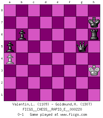 Last move : 0-1 2018 December 24 11:21:38 [Event "FICGS__CHESS__RAPID_E__000220"] [Site "FICGS"] [Date "2018.10.31"] [Round "1"] [White "Valentin,Laurentiu"] [Black "Goldmund,Heike"] [Result "0-1"] [WhiteElo "1109"] [BlackElo "1307"] 1.d4 Nf6 2.c4 b6 3.Nc3 Bb7 4.Bg5 e6 5.e4 Be7 6.Nf3 Nxe4 7.Bxe7 Qxe7 8.Bd3 Nxc3 9.bxc3 c5 10.O-O d5 11.cxd5 Bxd5 12.c4 Bb7 13.d5 O-O 14.Re1 Qf6 15.Be4 Rd8 16.Qb3 Na6 17.Rad1 Nc7 18.dxe6 Nxe6 19.Bxb7 Rab8 20.Bd5 Nf4 21.Re5 Qg6 22.Rg5 Qf6 23.h4 h6 24.Rg4 Qf5 25.Rg3 Ne2+ 26.Kh2 Nxg3 27.Kxg3 Qg6+ 28.Kh2 Qd6+ 29.Kh3 Qd7+ 30.Kh2 Qe7 31.Re1 Qf6 32.g3 a6 33.Ne5 Qxf2+ 34.Kh3 Qxe1 35.Nxf7 Qf1+ 36.Kh2 Rxd5 37.Nxh6+ gxh6 38.cxd5 Qf2+ 39.Kh3 Qd4 40.Qf3 Rd8 41.Qb3 Rd6 42.Qa3 a5 43.Qb3 Qxd5 44.Qe3 Qe6+ 45.Qxe6+ Rxe6 46.a4 c4 47.g4 c3 48.g5 c2 49.gxh6 c1Q 50.h5 Qg5 51.h7+ Kxh7 52.h6 Rxh6+ 0-1 Queen's Indian Accelerated Kingside Castling by player White (move 10) Kingside Castling by player Black (move 13) 10 pieces endgame at move 45 : White KPPP , Black KRPPPP WHITE : King + 3 Pawns BLACK : King + 1 Rook 4 Pawns 9 pieces endgame at move 49 : White KPPP , Black KRPPP WHITE : King + 3 Pawns BLACK : King + 1 Rook 3 Pawns Promotion Queen by player Black (move 49) 8 pieces endgame at move 51 : White KPP , Black KQRPP WHITE : King + 2 Pawns BLACK : King + 1 Queen 1 Rook 2 Pawns 7 pieces endgame at move 52 : White KP , Black KQRPP WHITE : King + 1 Pawn BLACK : King + 1 Queen 1 Rook 2 Pawns Player Black won this chess game. Follow this game move after move (download)If you aren't afraid of Spassky, then I have removed the element of money. (Jim Slater) Verschiedene, sehr schätzbare und im Laufe des Lebens nützliche Eigenschaften des Geistes können durch das Schachspiel erworben und gekräftigt werden, so dass sie zu Gewohnheiten werden, die uns nie im Stich lassen. (Benjamin Franklin) Algunos sacrificios son sólidos, los demás son míos. (Mikhail Tal) J'apprécie les joueurs d'est-indienne, c'est grâce à eux que je nourris ma famille depuis tant d'années. (Petrosian) No man has ever achieved immortality in his own life time. (Unknown)