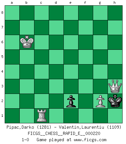 Last move : 1-0 2018 December 15 20:5:16 [Event "FICGS__CHESS__RAPID_E__000220"] [Site "FICGS"] [Date "2018.10.31"] [Round "1"] [White "Pipac,Darko"] [Black "Valentin,Laurentiu"] [Result "1-0"] [WhiteElo "1281"] [BlackElo "1109"] 1.e4 c5 2.a3 d6 3.Bb5+ Bd7 4.Bxd7+ Qxd7 5.Nc3 Nc6 6.d3 e6 7.Qg4 Nf6 8.Qf4 Nd4 9.Kd1 Be7 10.Nf3 e5 11.Qg3 O-O 12.Bh6 Ne8 13.Nd5 Kh8 14.Nxd4 cxd4 15.Bg5 f6 16.Bd2 Nc7 17.Nxc7 Qxc7 18.f4 Qb6 19.b3 Rac8 20.f5 Rc6 21.h4 Rfc8 22.Rc1 Qc7 23.c4 dxc3 24.Be3 c2+ 25.Kd2 Rc3 26.h5 h6 27.Bxa7 b6 28.Bxb6 Qxb6 29.b4 Qa6 30.Rh4 Qxd3+ 31.Qxd3 Rxd3+ 32.Kxd3 Ra8 33.Rxc2 Rxa3+ 34.Kc4 Ra8 35.Kd5 Kg8 36.b5 Kf7 37.Rh3 Ra4 38.Rb3 Rd4+ 39.Kc6 Rxe4 40.b6 Rf4 41.b7 Rxf5 42.b8Q Rxh5 43.Rb7 e4 44.Qxd6 Re5 45.Rc5 Re6 46.Rxe7+ Rxe7 47.Kb6 Re6 48.Rc7+ Re7 49.Qxe7+ Kg6 50.Qxg7+ Kf5 51.Rc5+ Kf4 52.Qxh6+ Kg3 53.Qxf6 e3 54.Qf3+ Kh2 55.Rc1 e2 56.Qh3+ 1-0 Sicilian defense Kingside Castling by player Black (move 11) Promotion Queen by player White (move 42) 10 pieces endgame at move 46 : White KQRP , Black KRPPPP WHITE : King + 1 Queen 1 Rook 1 Pawn BLACK : King + 1 Rook 4 Pawns 9 pieces endgame at move 49 : White KQRP , Black KPPPP WHITE : King + 1 Queen 1 Rook 1 Pawn BLACK : King + 4 Pawns 8 pieces endgame at move 50 : White KQRP , Black KPPP WHITE : King + 1 Queen 1 Rook 1 Pawn BLACK : King + 3 Pawns 7 pieces endgame at move 52 : White KQRP , Black KPP WHITE : King + 1 Queen 1 Rook 1 Pawn BLACK : King + 2 Pawns 6 pieces endgame at move 53 : White KQRP , Black KP WHITE : King + 1 Queen 1 Rook 1 Pawn BLACK : King + 1 Pawn Player White won this chess game. Follow this game move after move (download)Those who say they understand Chess, understand nothing. (Robert Hubner) Ich habe Kasparov in Rente geschickt. (Veselin Topalov) La belleza de un movimiento no se refleja solo en su apariencia, sino en el pensamiento detrás de él. (Siegbert Tarrasch) On est toujours la mazette de quelqu'un d'autre. (Anonyme) Everything in life is luck. (Donald Trump)