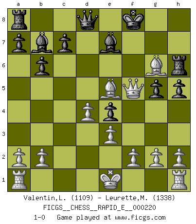 Last move : 1-0 2018 November 13 21:48:58 [Event "FICGS__CHESS__RAPID_E__000220"] [Site "FICGS"] [Date "2018.10.31"] [Round "1"] [White "Valentin,Laurentiu"] [Black "Leurette,Marc-Antoine"] [Result "1-0"] [WhiteElo "1109"] [BlackElo "1338"] 1.d4 d5 2.c4 e6 3.Nc3 Nf6 4.cxd5 exd5 5.Bg5 Be7 6.Nf3 b6 7.e3 Bb7 8.Be2 h6 9.Bh4 g5 10.Bg3 Ne4 11.Nxe4 dxe4 12.Ne5 Nd7 13.Bc4 Nxe5 14.Bxe5 Rh7 15.Qg4 h5 16.Qf5 Rh6 17.Bxf7+ Kf8 18.Bg6 1-0 QGD : Exchange, positional line Player White won this chess game. Follow this game move after move (download)Mistrust is the most necessary characteristic of the Chess player. (Siegbert Tarrasch) Über die Verhaftung Bobby Fischers: Warum es die Bush-Administration für nötig befindet einen 61 Jahre alten Mann zu hetzten, der für niemanden ausser sich selbste eine Gefahr darstellt ist ein Rätsel. (Nigel Short) El Ajedrez es en su esencia, un juego. En su forma, un arte. Y en su ejecución, una ciencia. (Baron Tassilo) Tout change constamment, y compris dans le monde des Echecs. (Botvinnik) Thus, what is of supreme importance in war is to attack the enemy's strategy. (Sun Tzu)