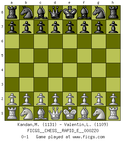 Last move : 0-1 2018 November 30 23:59:28 [Event "FICGS__CHESS__RAPID_E__000220"] [Site "FICGS"] [Date "2018.10.31"] [Round "1"] [White "Kandan,Manikandan"] [Black "Valentin,Laurentiu"] [Result "0-1"] [WhiteElo "1131"] [BlackElo "1109"] 0-1 This chess game has been lost on time (started : 2018.10.31 20:28:39) Player Black won this chess game. Follow this game move after move (download)Of all my Russian books, the defense contains and diffuses the greatest 'warmth' which may seem odd seeing how supremely abstract Chess is supposed to be. (Vladimir Nabokov) Ein Schachspiel besteht aus drei Phasen: Die erste, wenn du hofftst den Vorteil zu haben, die zweite, wenn du glaubst einen Vorteil zu haben, und die dritte.... wenn du weißt Du wirst verlieren. (Savielly Grigorievitsch Tartakower) El Ajedrez, como cualquier otra actividad creativa, puede existir solo a través de méritos combinados de aquellos que tienen talento creativo y de aquellos que tienen la habilidad de organizar un trabajo creativo. (Mikhail Botvinnik) Votre seul travail dans les ouvertures est d'obtenir un milieu de partie jouable. (Lajos Portish) When you stop learning you start dying. (M. Scott Adams)