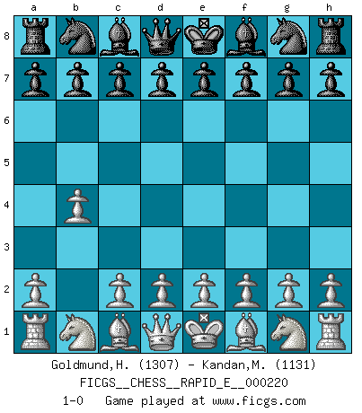 Last move : 1-0 2018 November 30 23:59:28 [Event "FICGS__CHESS__RAPID_E__000220"] [Site "FICGS"] [Date "2018.10.31"] [Round "1"] [White "Goldmund,Heike"] [Black "Kandan,Manikandan"] [Result "1-0"] [WhiteElo "1307"] [BlackElo "1131"] 1.b4 1-0 This chess game has been lost on time (started : 2018.10.31 20:28:39) Polish (Sokolsky) opening Player White won this chess game. Follow this game move after move (download)First-class players lose to second class players because second-class players sometimes play a first-class game. (Tarrasch) Ich bewundere Kasparows phantasievolle Angriffssiege aus den Achtzigern und Neunzigern, aber wenn man sie mit dem Computer überprüft, nimmt der Computer in jeder zweiten Partie die Opfer an, verteidigt sich und gewinnt. (Vladimir Kramnik) Los problemas de Ajedrez exigen del compositor las mismas virtudes que caracterizan todo el arte de valor: originalidad, invención, concisión, armonía, complejidad e insinceridad explendida. (Vladimir Nabokov) Les Echecs sont et restent toujours un combat, un combat intégral comme la boxe, la lutte ou un autre sport, et où il doit y avoir un vainqueur et un vaincu. (Joseph Emil Diemer) My poor ole parrot... Is not in the circulation of displays ....poo hoo hoo :) (Wayne Lowrance's enigma)
