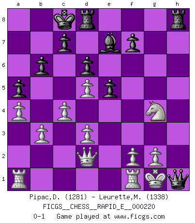 Last move : 0-1 2018 November 10 12:41:8 [Event "FICGS__CHESS__RAPID_E__000220"] [Site "FICGS"] [Date "2018.10.31"] [Round "1"] [White "Pipac,Darko"] [Black "Leurette,Marc-Antoine"] [Result "0-1"] [WhiteElo "1281"] [BlackElo "1338"] 1.e4 e5 2.a3 Nf6 3.Nc3 Nc6 4.Nf3 d6 5.h3 b6 6.Bb5 Bd7 7.d3 a6 8.Bxc6 Bxc6 9.Bg5 h6 10.Bxf6 Qxf6 11.a4 a5 12.O-O Be7 13.b3 O-O-O 14.Qd2 h5 15.Nd5 Bxd5 16.exd5 g5 17.c4 g4 18.hxg4 hxg4 19.Nh2 Qh4 20.Nxg4 Qh1+ 0-1 Variation Mengarini's Opening : Mengarini's Opening Kingside Castling by player White (move 12) Queenside Castling by player Black (move 13) Player Black won this chess game. Follow this game move after move (download)Chess demands total concentration. (Bobby Fischer) Ich kenne Menschen, die allen Willen der Welt besitzen und doch nicht Schach spielen können. (Robert James Fischer) Fischer no está bajo la obligación de nadie. (Joseph Platz) Les échecs, c'est la lutte contre l'erreur. (Johannes Zukertort) Shallow men believe in luck. Strong men belive in cause and effect. (Ralph Waldo Emerson)