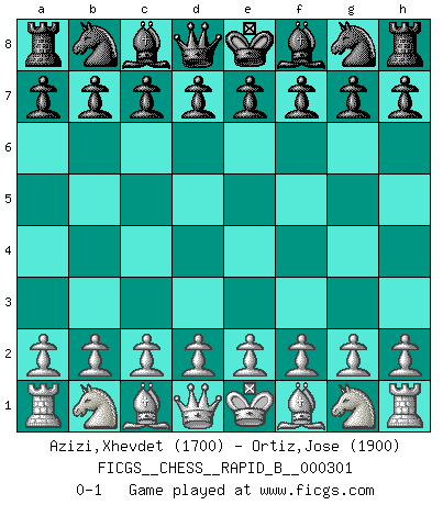 Last move : 0-1 2018 December 1 11:58:35 [Event "FICGS__CHESS__RAPID_B__000301"] [Site "FICGS"] [Date "2018.11.01"] [Round "1"] [White "Azizi,Xhevdet"] [Black "Ortiz,Jose"] [Result "0-1"] [WhiteElo "1700"] [BlackElo "1900"] 0-1 This chess game has been lost on time (started : 2018.11.01 4:1:6) Player Black won this chess game. Follow this game move after move (download)Openings teach you openings. Endgames teach you chess ! (Stephan Gerzadowicz) Moralische Siege zählen nicht. (Savielly Grigorievitsch Tartakower) El hombre es un frívolo, una creatura engañosa y como un jugador de Ajedrez, se preocupa mas por el proceso de obtener su meta que de la meta por sí misma. (Dostoyevsky) Mon pion favori sur ma case favorite ! Bronstein en parlant d'un coup de pion en h5 quand il avait les Noirs. God, you are such an idiot. - Actually, I thought I was more of a jerk. (Gregory House to Stacy Warner, House M.D.)
