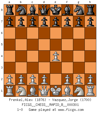 Last move : 1-0 2018 December 1 11:58:35 [Event "FICGS__CHESS__RAPID_B__000301"] [Site "FICGS"] [Date "2018.11.01"] [Round "1"] [White "Frenkel,Alex"] [Black "Vazquez,Jorge"] [Result "1-0"] [WhiteElo "1876"] [BlackElo "1700"] 1.e4 1-0 This chess game has been lost on time (started : 2018.11.01 4:1:6) King's pawn Opening Player White won this chess game. Follow this game move after move (download)Chess is really ninety nine percent calculation. (Soltis) Im Schach gibt es keinen Platz für Galanterie. (Irving Chernev) Una buena ofensiva y una buena defensa, comienzan ambas con un buen desarrollo. (Bruce A. Moon) La solitude du joueur d'Echecs à l'approche du mat est semblable à celle du condamné. (Francis Szpiner) A mistake is only a mistake if you let it happen twice. Otherwise it is a learning experience. (Daniel Parmet)