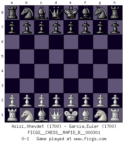 Last move : 0-1 2018 December 1 11:58:35 [Event "FICGS__CHESS__RAPID_B__000301"] [Site "FICGS"] [Date "2018.11.01"] [Round "1"] [White "Azizi,Xhevdet"] [Black "Garcia,Euler"] [Result "0-1"] [WhiteElo "1700"] [BlackElo "1700"] 0-1 This chess game has been lost on time (started : 2018.11.01 4:1:6) Player Black won this chess game. Follow this game move after move (download)Capture of the adverse King is the ultimate but not the first object of the game. (William Steinitz) Die Auseinandersetzung mit Karpow war politisch geprägt. Er stand für das kommunistische System, wurde von dessen Repräsentanten gehätschelt. Ich war der Oppositionelle. Jeder Schachweltmeister spiegelt auch die gesellschaftlichen Verhältnisse wider. Kramnik steht für die Börsen-Generation des Neuen Markts, ideologiefrei, zahlenfixiert. (Garry Kasparov) Todos los jugadores de Ajedrez deberían tener un pasatiempo. (Savielly Tartakower) Les Echecs sont et restent toujours un combat, un combat intégral comme la boxe, la lutte ou un autre sport, et où il doit y avoir un vainqueur et un vaincu. (Joseph Emil Diemer) Success without honor is an unseasoned dish; it will satisfy your hunger, but it won't taste good. (Joe Paterno)