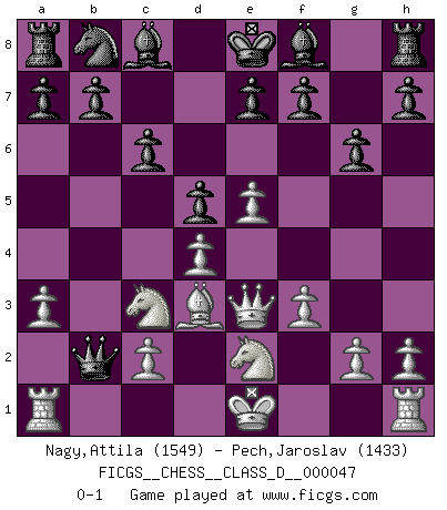 Last move : 0-1 2007 October 24 8:1:50 [Event "FICGS__CHESS__CLASS_D__000047"] [Site "FICGS"] [Date "2007.05.23"] [Round "1"] [White "Nagy,Attila"] [Black "Pech,Jaroslav"] [Result "0-1"] [WhiteElo "1549"] [BlackElo "1433"] 1.e4 d6 2.d4 Nf6 3.Nc3 c6 4.f3 g6 5.Be3 Qb6 6.a3 d5 7.e5 Nh5 8.Bd3 Ng7 9.Nge2 Nf5 10.Qd2 Nxe3 11.Qxe3 Qxb2 0-1 This chess game has been lost on time (started : 2007.05.23 14:20:7) Pirc : Ufimtsev-Pytel variation Player Black won this chess game. Follow this game move after move (download)Not all artists are Chess players, but all Chess players are artists. (Marcel Duchamp) Ich möchte Schüler heranbilden, die das Vermögen haben, selbst zu denken und Kritik zu üben. (Emanuel Lasker) Ciertamente, de todas la drogas del mundo, el Ajedrez debe ser el mas placentero permamentemente. (Assiac) Aidez vos pièces, elles vous aideront. (Paul Morphy) I've never seen so many men wasted so badly. (Blondie in The Good, The Bad and The Ugly)