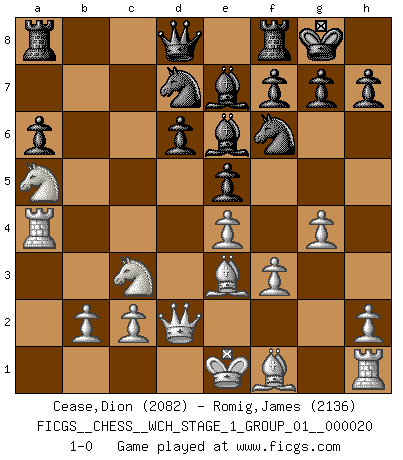 Last move : 1-0 2019 January 13 17:33:45 [Event "FICGS__CHESS__WCH_STAGE_1_GROUP_01__000020"] [Site "FICGS"] [Date "2018.11.01"] [Round "1"] [White "Cease,Dion"] [Black "Romig,James"] [Result "1-0"] [WhiteElo "2082"] [BlackElo "2136"] 1.e4 c5 2.Nf3 d6 3.d4 cxd4 4.Nxd4 Nf6 5.Nc3 a6 6.f3 e5 7.Nb3 Be6 8.Be3 Nbd7 9.g4 Be7 10.Qd2 b5 11.a4 bxa4 12.Rxa4 O-O 13.Na5 1-0 Sicilian : Najdorf Kingside Castling by player Black (move 12) Player White won this chess game. Follow this game move after move (download)I still hope to kill Fischer. (Boris Spassky) Es liegt in der Natur, vernüftig zu denken und unlogisch zu handeln. (Anatole France) El Ajedrez es parte de una cultura y si una cultura esta en decadencia, entonces también el Ajedrez declinará. (Mikhail Botvinnik) Un millionnaire : 'Monsieur Steinitz ! Vous ne participez aux tournois que pour l'argent, alors que moi je n'y viens que pour l'honneur.' Steinitz : 'Chacun joue pour ce qu'il n'a pas'... We cannot be sure of having something to live for unless we are willing to die for it. (Ernesto Che Guevara)