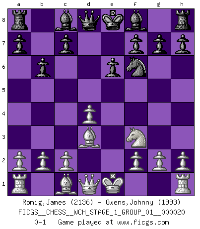 Last move : 0-1 2019 January 22 18:49:29 [Event "FICGS__CHESS__WCH_STAGE_1_GROUP_01__000020"] [Site "FICGS"] [Date "2018.11.01"] [Round "1"] [White "Romig,James"] [Black "Owens,Johnny"] [Result "0-1"] [WhiteElo "2136"] [BlackElo "1993"] 1.e4 e6 2.d4 d5 3.Nc3 dxe4 4.Nxe4 Nd7 5.Nf3 Ngf6 6.Nxf6+ Nxf6 7.Bd3 b6 0-1 This chess game has been lost on time (started : 2018.11.01 15:27:23) French : Rubinstein variation Player Black won this chess game. Follow this game move after move (download)I like the moment when I break a man's ego. (Bobby Fischer) Der Partner hat auch seine Existenzberechtigung. (Savielly Grigorievitsch Tartakower) El Ajedrez es un juego de pelea el cual es puramente intelectual e incluye la suerte. (Richard Reti) La vérité est comme le meilleur coup aux échecs : elle existe, mais il faut la chercher. (Arturo Perez-Reverte) The general who wins the battle makes many calculations in his temple before the battle is fought. The general who loses makes but few calculations beforehand. (Sun Tzu)