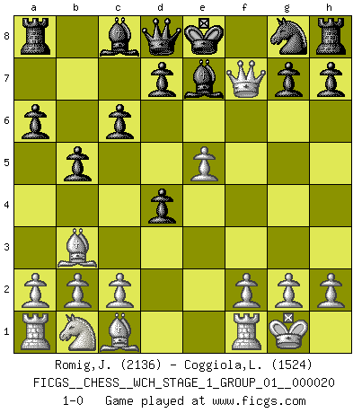 Last move : 1-0 2018 November 12 5:15:49 [Event "FICGS__CHESS__WCH_STAGE_1_GROUP_01__000020"] [Site "FICGS"] [Date "2018.11.01"] [Round "1"] [White "Romig,James"] [Black "Coggiola,Leandro Damian"] [Result "1-0"] [WhiteElo "2136"] [BlackElo "1524"] 1.e4 e5 2.Nf3 Nc6 3.Bb5 a6 4.Ba4 b5 5.Bb3 Nf6 6.O-O Be7 7.d4 Nxd4 8.Nxd4 exd4 9.e5 Ng8 10.Qf3 c6 11.Qxf7+ 1-0 Ruy Lopez : Caro variation Kingside Castling by player White (move 6) Player White won this chess game. Follow this game move after move (download)Of Chess it has been said that life is not long enough for it, but that is the fault of life, not Chess. (William Ewart Napier) Man braucht nicht immer den besten Zug zu spielen: Ein Zug muß aktiv, unternehmungslustig, korrekt und schön sein. (David Bronstein) No todos los artistas son jugadores de Ajedrez, pero todos los jugadores de Ajedrez son artistas. (Marcel Duchamp) Les échecs sont un jeu terrible. Si vous n'avez pas le centre, votre adversaire a une position plus libre. Par contre, si vous avez le centre, alors vous avez vraiment quelque chose pour laquelle vous inquiéter ! (Siegbert Tarrasch) Drag your thoughts away from your troubles... by the ears, by the heels, or any other way you can manage it. (Mark Twain)