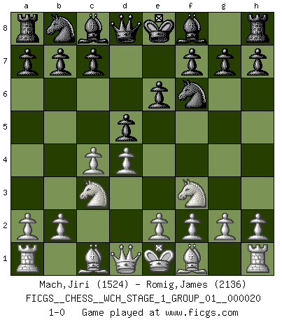 Last move : 1-0 2019 January 19 18:39:5 [Event "FICGS__CHESS__WCH_STAGE_1_GROUP_01__000020"] [Site "FICGS"] [Date "2018.11.01"] [Round "1"] [White "Mach,Jiri"] [Black "Romig,James"] [Result "1-0"] [WhiteElo "1524"] [BlackElo "2136"] 1.d4 Nf6 2.c4 e6 3.Nc3 d5 4.Nf3 1-0 This chess game has been lost on time (started : 2018.11.01 15:27:23) Queen's pawn game Player White won this chess game. Follow this game move after move (download)The stomach is an essential part of the Chess master. (Bent Larsen) Deine Wertungszahl - vorausgesetzt einige Jahre schachliche Anstrengung - entspricht etwa dem zehnfachen Deines IQ plus 1000. (Jonathan Levitt) Siempre es mejor sacrificar los hombres de tu oponente. (Savielly Tartakower) Demandez au pauvre Cg1 ce qu'il en pense. Eduard Gufeld à propos de la variante Saemisch de l'Est-Indienne. If you ain't just a little scared when you enter a casino, you are either very rich or you haven't studied the games enough. (Pappy)