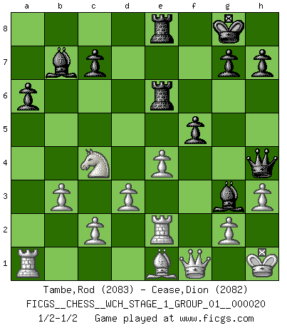 Last move : 1/2-1/2 2019 January 15 22:19:24 [Event "FICGS__CHESS__WCH_STAGE_1_GROUP_01__000020"] [Site "FICGS"] [Date "2018.11.01"] [Round "1"] [White "Tambe,Rod"] [Black "Cease,Dion"] [Result "1/2-1/2"] [WhiteElo "2083"] [BlackElo "2082"] 1.e4 e5 2.Nf3 Nc6 3.Bb5 a6 4.Ba4 Nf6 5.O-O Be7 6.Re1 b5 7.Bb3 O-O 8.h3 Bb7 9.d3 d5 10.exd5 Nxd5 11.Nc3 Nxc3 12.bxc3 Bf6 13.Bb2 Re8 14.Nd2 Na5 15.c4 Re6 16.Re2 Bh4 17.f3 Bg3 18.Kh1 bxc4 19.Nxc4 Nxb3 20.axb3 Qh4 21.Qf1 Rae8 22.Bc3 f5 23.Be1 e4 24.fxe4 1/2-1/2 Ruy Lopez : Closed, 7...O-O Kingside Castling by player White (move 5) Kingside Castling by player Black (move 7) This chess game ended in a draw. Follow this game move after move (download)Bobby Fischer's current state of mind is indeed a tragedy. One of the world's greatest Chess players - the pride and sorrow of American Chess. (Frank Brady) Man gibt nur Pakete auf. (Paul Keres) Una buena ofensiva y una buena defensa, comienzan ambas con un buen desarrollo. (Bruce A. Moon) Nous vivons dans un monde échiquéen : chaque jour qui passe est un défi à relever. (Philosophe Sasha) We're missing something. (Gregory House, House M.D.)