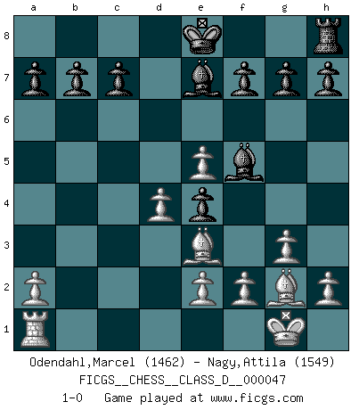 Last move : 1-0 2007 October 11 6:23:24 [Event "FICGS__CHESS__CLASS_D__000047"] [Site "FICGS"] [Date "2007.05.23"] [Round "1"] [White "Odendahl,Marcel"] [Black "Nagy,Attila"] [Result "1-0"] [WhiteElo "1462"] [BlackElo "1549"] 1.c4 e5 2.Nc3 Nc6 3.Nf3 Nf6 4.g3 d5 5.cxd5 Nxd5 6.Bg2 Be6 7.O-O Be7 8.d4 Nxc3 9.bxc3 e4 10.Ne5 Nxe5 11.dxe5 Qxd1 12.Rxd1 Bf5 13.Rd4 Rd8 14.Be3 Rxd4 15.cxd4 1-0 This chess game has been lost on time (started : 2007.05.23 14:20:7) English : Four knights, kingside Fianchetto Kingside Castling by player White (move 7) Player White won this chess game. Follow this game move after move (download)Before the endgame, the Gods have placed the middle game. (Siegbert Tarrasch) Ich brauche nur einen Blick auf das Schachbrett zu werfen, und weiß schon, was in der Stellung steckt, was geschehen kann und was geschehen wird. Alle übrigen suchen und prüfen, ich aber weiß es! (José Raúl Capablanca) Una partida de Ajedrez se divide en 3 etapas: la primera cuando piensas que tienes la ventaja, la segunda cuando crees que tienes la ventaja y la tercera... ¡cuando te das cuenta que vas a perder!. (Savielly Tartakower) Tout change constamment, y compris dans le monde des Echecs. (Botvinnik) The general who wins the battle makes many calculations in his temple before the battle is fought. The general who loses makes but few calculations beforehand. (Sun Tzu)