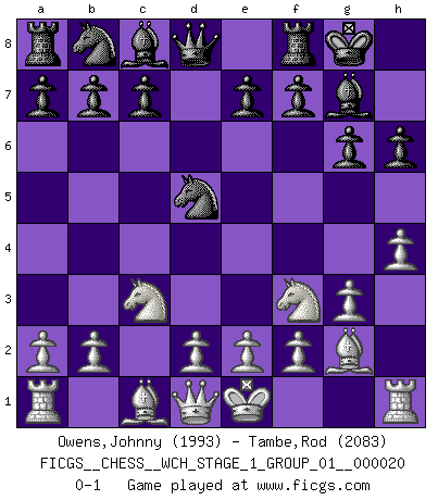 Last move : 0-1 2018 December 19 2:15:51 [Event "FICGS__CHESS__WCH_STAGE_1_GROUP_01__000020"] [Site "FICGS"] [Date "2018.11.01"] [Round "1"] [White "Owens,Johnny"] [Black "Tambe,Rod"] [Result "0-1"] [WhiteElo "1993"] [BlackElo "2083"] 1.Nf3 g6 2.g3 Nf6 3.Bg2 Bg7 4.c4 O-O 5.Nc3 d5 6.cxd5 Nxd5 7.h4 h6 0-1 This chess game has been lost on time (started : 2018.11.01 15:27:23) Reti Opening Kingside Castling by player Black (move 4) Player Black won this chess game. Follow this game move after move (download)I like the moment when I break a man's ego. (Bobby Fischer) Ihnen, Herr Lasker, habe ich nur drei Worte zu sagen: Schach und matt. (Siegbert Tarrasch) El Ajedrez es el arte del análisis. (Mikhail Botvinnik) Les échecs sont utiles à l'exercice de la faculté de penser et à celle de l'imagination. Car nous devons posséder une méthode élaborée pour atteindre des buts partout où nous devons conduire notre raison. (Leibnitz) History is a gallery of pictures in which there are few originals and many copies. (Alexis de Tocqueville)