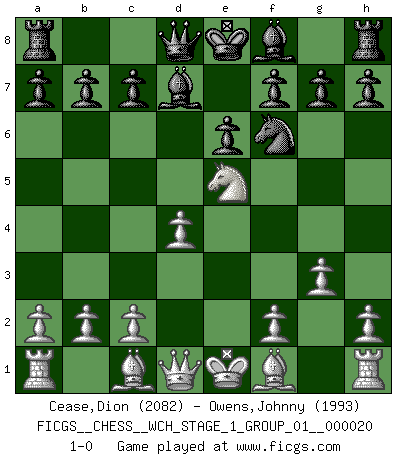Last move : 1-0 2018 December 24 2:52:42 [Event "FICGS__CHESS__WCH_STAGE_1_GROUP_01__000020"] [Site "FICGS"] [Date "2018.11.01"] [Round "1"] [White "Cease,Dion"] [Black "Owens,Johnny"] [Result "1-0"] [WhiteElo "2082"] [BlackElo "1993"] 1.e4 e6 2.d4 d5 3.Nc3 dxe4 4.Nxe4 Nd7 5.Nf3 Ngf6 6.Nxf6+ Nxf6 7.g3 Bd7 8.Ne5 1-0 This chess game has been lost on time (started : 2018.11.01 15:27:23) French : Rubinstein variation Player White won this chess game. Follow this game move after move (download)A bad plan is better than none at all. (Frank Marshall) Alles was am Schachbrett zählt sind gute Züge. (Robert James Fischer) La partida mas dura de ganar es una partida ganada. (Emanuel Lasker) C'est la seule position que je connaisse où les deux camps sont mals. Propos prêtés à V. Anand. To steal ideas from one person is plagiarism. To steal from many is research. (Unknown)