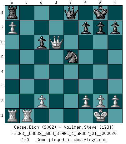 Last move : 1-0 2018 December 29 12:5:21 [Event "FICGS__CHESS__WCH_STAGE_1_GROUP_01__000020"] [Site "FICGS"] [Date "2018.11.01"] [Round "1"] [White "Cease,Dion"] [Black "Vollmer,Steve"] [Result "1-0"] [WhiteElo "2082"] [BlackElo "1781"] 1.e4 e5 2.Nf3 Nc6 3.Bb5 a6 4.Ba4 Nf6 5.O-O b5 6.Bb3 Be7 7.d4 exd4 8.e5 Ng4 9.Re1 d6 10.Bd5 Bb7 11.Nxd4 Ngxe5 12.Nxc6 Nxc6 13.Bg5 Qd7 14.Bxe7 Nxe7 15.Bxb7 Rb8 16.Nc3 O-O 17.Bxa6 Ng6 18.Bxb5 Rxb5 19.Nxb5 Qxb5 20.a4 Qxb2 21.a5 Ra8 22.Qd5 Qb8 23.a6 Ne5 24.Reb1 Qe8 25.a7 c6 26.Qxd6 1-0 Ruy Lopez : 5.O-O Kingside Castling by player White (move 5) Kingside Castling by player Black (move 16) Player White won this chess game. Follow this game move after move (download)You must take your opponent into a deep dark forest where 2+2=5, and the path leading out is only wide enough for one. (Mikhail Tal) Ich tröste mich mit dem Vergnügen, daß Schachfans, Zuschauer und Leser glücklich sind, wenn ein Großmeister etwas riskiert, statt nur Klötzchen zu schieben. (Mikhail Nekhemyevich Tal) Las Aperturas te enseñan aperturas. ¡Los Finales te enseñan Ajedrez!. (Stephan Gerzadowicz) Pour moi, les échecs ne sont pas un jeu mais un art. (Alexandre Alekhine) Wisdom doesn't necessarily come with age. Sometimes age just shows up all by itself. (Tom Wilson)