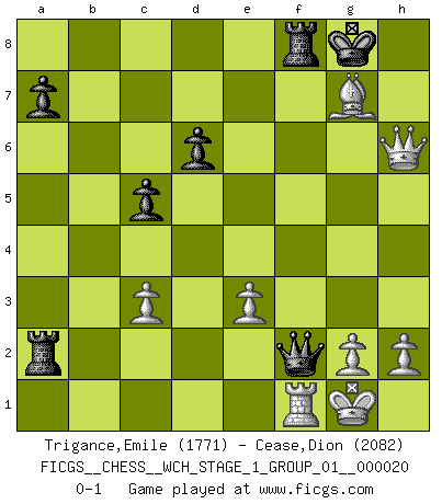Last move : 0-1 2019 January 7 17:57:50 [Event "FICGS__CHESS__WCH_STAGE_1_GROUP_01__000020"] [Site "FICGS"] [Date "2018.11.01"] [Round "1"] [White "Trigance,Emile"] [Black "Cease,Dion"] [Result "0-1"] [WhiteElo "1771"] [BlackElo "2082"] 1.d4 Nf6 2.c4 e6 3.Nc3 Bb4 4.Bg5 c5 5.d5 d6 6.e3 exd5 7.cxd5 Nbd7 8.Bb5 h6 9.Bh4 Bxc3+ 10.bxc3 Qa5 11.Qb3 Nxd5 12.Ne2 Nc7 13.Bxd7+ Bxd7 14.Qxb7 O-O 15.Bg3 Rfb8 16.Qf3 Qa6 17.O-O Bc6 18.Qg4 Rb2 19.Nf4 Rxa2 20.Nh5 Ne8 21.Rad1 g6 22.Bh4 Bb5 23.Nf4 Bxf1 24.Nxg6 fxg6 25.Qxg6+ Ng7 26.Bf6 Qb7 27.Rxf1 Qf7 28.Qxh6 Rf8 29.Bxg7 Qxf2+ 0-1 Nimzo-Indian : Leningrad variation Kingside Castling by player Black (move 14) Kingside Castling by player White (move 17) Player Black won this chess game. Follow this game move after move (download)It is no time to be playing Chess when the house is on fire. (Italian Proverb) Die Partien sind immer verschieden, die Interviews immer die gleichen. (Garry Kasparov) El Ajedrez no es una pizca de inferior al violín, y tenemos un gran número de violinistas profesionales. (Mikhail Botvinnik) Les sacrifices démontrent seulement que quelqu'un a gaffé. (Savielly Tartacover) They say poker is a zero-sum game. It must be, because every time I play my sum ends up zero. (Max Shapiro)