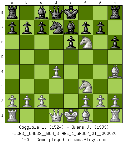 Last move : 1-0 2018 December 14 1:45:43 [Event "FICGS__CHESS__WCH_STAGE_1_GROUP_01__000020"] [Site "FICGS"] [Date "2018.11.01"] [Round "1"] [White "Coggiola,Leandro Damian"] [Black "Owens,Johnny"] [Result "1-0"] [WhiteElo "1524"] [BlackElo "1993"] 1.e4 e6 2.d4 d5 3.Nc3 dxe4 4.Nxe4 Nd7 5.Nf3 Ngf6 6.Bg5 h6 7.Bh4 Be7 8.Nxf6+ 1-0 This chess game has been lost on time (started : 2018.11.01 15:27:23) French : Rubinstein variation Player White won this chess game. Follow this game move after move (download)A win by an unsound combination, however showy, fills me with artistic horror. (Wilhelm Steinitz) Es ist schade, dass viele Schachsportler vergessen, wie wichtig Auftreten und angemessene Kleidung sind. (Alexandra Kosteniuk) Un mal día en el Ajedrez, es mejor que cualquier buen día en el trabajo. (Anonymous) On a dit que l'homme se distingue de l'animal par le fait qu'il achète plus de livres qu'il ne peut en lire. Je voudrais suggérer qu'inclure à la liste des livres quelques livres d'échecs rendrait la distinction manifeste. (Edward Lasker) The meaning of life is that it is to be lived, and it is not to be traded and conceptualized and squeezed into a pattern of systems. (Bruce Lee)