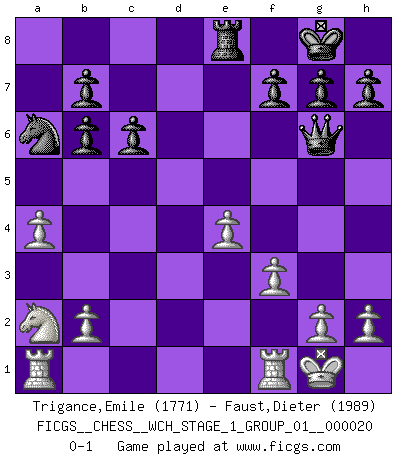 Last move : 0-1 2018 December 23 15:57:11 [Event "FICGS__CHESS__WCH_STAGE_1_GROUP_01__000020"] [Site "FICGS"] [Date "2018.11.01"] [Round "1"] [White "Trigance,Emile"] [Black "Faust,Dieter"] [Result "0-1"] [WhiteElo "1771"] [BlackElo "1989"] 1.d4 d5 2.c4 c6 3.Nf3 Nf6 4.Nc3 dxc4 5.a4 Bf5 6.e3 e6 7.Bxc4 Bb4 8.O-O O-O 9.Qe2 Ne4 10.Na2 Ba5 11.Bd3 Re8 12.Qc2 Ng5 13.Nxg5 Bxd3 14.Qxd3 Qxg5 15.e4 Qg6 16.Bf4 Na6 17.f3 Rad8 18.Be3 e5 19.Qc4 exd4 20.Bxd4 Rxd4 21.Qxd4 Bb6 22.Qxb6 axb6 0-1 QGD Slav : Dutch variation Kingside Castling by player White (move 8) Kingside Castling by player Black (move 8) Player Black won this chess game. Follow this game move after move (download)Chess is like war on a board. (Bobby Fischer) Du kannst im Schach nur gut werden, wenn du das Spiel liebst. (Robert James Fischer) No solamente yo pronostico su triunfo sobre Botvinnik, sino que me adelanto y digo que probablemente Fischer es el jugador de Ajedrez mas grande que haya existido. (John Collins) Les écrivains ont utilisé les échecs pour analyser les côtés extrêmes de la nature humaine. Dans ce cadre, les échecs offrent un champ d'expérimentation idéal. Mais on pourrait faire la même chose avec la peinture. Et là, en vous référant à Van Gogh, vous ne tirerez pas de conclusion définitive sur les peintres. (Gary Kasparov) The smarter you play, the luckier you'll be. (Mark Pilarski)