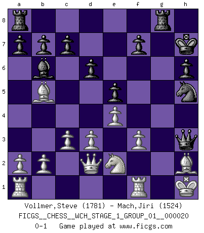 Last move : 0-1 2018 December 22 11:49:40 [Event "FICGS__CHESS__WCH_STAGE_1_GROUP_01__000020"] [Site "FICGS"] [Date "2018.11.01"] [Round "1"] [White "Vollmer,Steve"] [Black "Mach,Jiri"] [Result "0-1"] [WhiteElo "1781"] [BlackElo "1524"] 1.e4 e5 2.Nf3 Nc6 3.Bb5 Bc5 4.O-O Nf6 5.Nc3 O-O 6.d3 d6 7.h3 Nd4 8.Nxd4 Bxd4 9.Ne2 Bb6 10.Bg5 h6 11.Bh4 g5 12.Bg3 Nh5 13.Bh2 g4 14.hxg4 Bxg4 15.Qd2 Kh7 16.c3 Rg8 17.Kh1 Qh4 18.f3 Bh3 19.gxh3 Qxh3 0-1 Ruy Lopez : Classical (Cordel) defense Kingside Castling by player White (move 4) Kingside Castling by player Black (move 5) Player Black won this chess game. Follow this game move after move (download)Chess problems demand from the composer the same virtues that characterize all worthwhile art: originality, invention, conciseness, harmony, complexity, and splendid insincerity. (Vladimir Nabokov) Der Partner hat auch seine Existenzberechtigung. (Savielly Grigorievitsch Tartakower) El Ajedrez es un mar en el cual un mosquito puede beber y un elefante puede bañarse. (Refrán Hindú) Ne tendez aucun piège pour le plaisir ! Ne jouez rien dans l'espoir que l'adversaire réagisse de façon stupide ! Prenez toujours pour acquis que l'adversaire va trouver le meilleur coup ! Ne jouez jamais de coup dans l'espoir que l'adversaire ne voie pas la menace ! Chacun de vos coups doit améliorer la position d'une façon ou d'une autre. If you are going through hell, keep going. (Winston Churchill)
