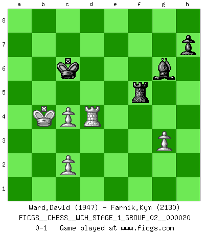 Last move : 0-1 2019 February 11 1:24:21 [Event "FICGS__CHESS__WCH_STAGE_1_GROUP_02__000020"] [Site "FICGS"] [Date "2018.11.01"] [Round "1"] [White "Ward,David"] [Black "Farnik,Kym"] [Result "0-1"] [WhiteElo "1947"] [BlackElo "2130"] 1.e4 c5 2.Nf3 d6 3.d4 cxd4 4.Nxd4 Nf6 5.Nc3 a6 6.Bc4 e6 7.Bb3 Nbd7 8.Bg5 Nc5 9.f4 Be7 10.Qf3 Qc7 11.O-O-O b5 12.Rhe1 Bb7 13.f5 Nxb3+ 14.axb3 b4 15.fxe6 bxc3 16.exf7+ Kxf7 17.bxc3 Rhe8 18.Nf5 Kg8 19.Nh6+ gxh6 20.Bxf6 Bxf6 21.Qxf6 Qg7 22.Rxd6 Qxf6 23.Rxf6 Bxe4 24.b4 h5 25.g3 Kg7 26.Rd6 a5 27.Rd4 Bg6 28.Rxe8 Bxe8 29.Kb2 Kf6 30.Rf4+ Ke7 31.Rd4 Bf7 32.Rf4 Bg6 33.Rc4 Rb8 34.Rf4 Rb5 35.Kb3 Re5 36.Rf2 Kd6 37.Rd2+ Kc7 38.Rf2 Be8 39.bxa5 Rxa5 40.c4 Kc6 41.Kb4 Re5 42.Rf6+ Kc7 43.Rf2 Bg6 44.Rd2 Kc6 45.Rf2 Rf5 46.Re2 Bf7 47.Rd2 h4 48.Rd4 hxg3 49.hxg3 Bg6 0-1 Sicilian : Najdorf, Lipnitzky attack Queenside Castling by player White (move 11) 10 pieces endgame at move 48 : White KRPPP , Black KRBPP WHITE : King + 1 Rook 3 Pawns BLACK : King + 1 Rook 1 Bishop 2 Pawns 9 pieces endgame at move 49 : White KRPPP , Black KRBP WHITE : King + 1 Rook 3 Pawns BLACK : King + 1 Rook 1 Bishop 1 Pawn Player Black won this chess game. Follow this game move after move (download)Up to this point White has been following well-known analysis. But now he makes a fatal error: he begins to use his own head. (Siegbert Tarrasch) Frage des Reporters: -Worin besteht das Ziel von Gambiteröffnungen? Antwort: -Auf Kosten der Partie einen Ruf als Angriffspieler zu erwerben.- (Siegbert Tarrasch) Hay jugadores fuertes y personas amables y yo soy un jugador fuerte. (Bobby Fischer) Vous savez, camarade Pachman, je n'éprouve pas de plaisir à être ministre, je jouerais plutôt aux échecs comme vous, ou alors ferais une révolution au Venezuela. (Che Guevara à Ludek Pachman, 'Checkmate in Prague', 1975) You can think I'm wrong, but that's no reason to quit thinking. (Gregory House, House M.D.)