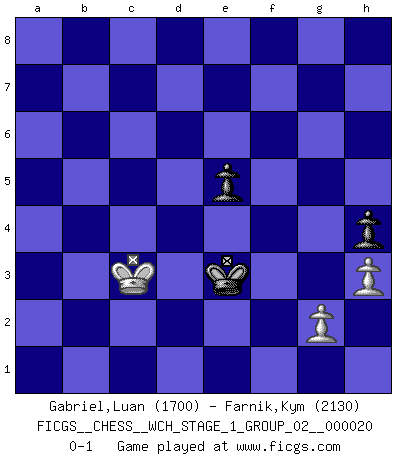 Last move : 0-1 2018 December 20 21:59:8 [Event "FICGS__CHESS__WCH_STAGE_1_GROUP_02__000020"] [Site "FICGS"] [Date "2018.11.01"] [Round "1"] [White "Gabriel,Luan"] [Black "Farnik,Kym"] [Result "0-1"] [WhiteElo "1700"] [BlackElo "2130"] 1.d4 Nf6 2.c4 g6 3.Nc3 d5 4.cxd5 Nxd5 5.e4 Nxc3 6.bxc3 Bg7 7.Bc4 c5 8.Ne2 Nc6 9.Be3 O-O 10.O-O e6 11.dxc5 Qa5 12.f4 Rd8 13.Qb3 Bf8 14.Bb5 Bd7 15.a4 a6 16.Qb2 axb5 17.axb5 Qc7 18.bxc6 Rxa1 19.Rxa1 Bxc6 20.e5 Rd3 21.Bd4 Qd8 22.Qa2 h5 23.h3 Be7 24.Kh2 Bh4 25.Rf1 Qd5 26.Qxd5 Bxd5 27.Bf2 Bxf2 28.Rxf2 h4 29.Kg1 Re3 30.Kf1 Kf8 31.Ke1 Be4 32.Kd2 Rd3+ 33.Ke1 Ke7 34.Nd4 Rxc3 35.Nf3 Rc1+ 36.Kd2 Rc2+ 37.Ke3 Rxf2 38.Kxf2 Bxf3 39.Kxf3 Kd7 40.Kg4 Kc6 41.Kg5 Kxc5 42.Kf6 b5 43.Kxf7 Kd5 44.Kxg6 b4 45.f5 b3 46.f6 b2 47.f7 b1Q+ 48.Kg7 Qf5 49.f8Q Qxf8+ 50.Kxf8 Kxe5 51.Ke7 Kf5 52.Kd6 e5 53.Kd5 Kf4 54.Kc4 Ke4 55.Kc3 Ke3 0-1 King's Indian defense, 3.Nc3 Kingside Castling by player Black (move 9) Kingside Castling by player White (move 10) 10 pieces endgame at move 43 : White KPPPP , Black KPPPP WHITE : King + 4 Pawns BLACK : King + 4 Pawns 9 pieces endgame at move 44 : White KPPPP , Black KPPP WHITE : King + 4 Pawns BLACK : King + 3 Pawns Promotion Queen by player Black (move 47) Promotion Queen by player White (move 49) 8 pieces endgame at move 49 : White KPPP , Black KQPP WHITE : King + 3 Pawns BLACK : King + 1 Queen 2 Pawns 7 pieces endgame at move 50 : White KPPP , Black KPP WHITE : King + 3 Pawns BLACK : King + 2 Pawns 6 pieces endgame at move 50 : White KPP , Black KPP WHITE : King + 2 Pawns BLACK : King + 2 Pawns Player Black won this chess game. Follow this game move after move (download)Chess is so inspiring that I do not believe a good player is capable of having an evil thought during the game. (Wilhelm Steinitz) Der Knackpunkt bei der Konzentration ist, daß wir nur durch sie etwas Neues und Ungewöhnliches am Schachbrett finden können. Sie ist der einzige Weg durch neue neue Ideen eine Überraschung zu bereiten. (Garry Kasparov) Si tu oponente te ofrece un empate, trata de averiguar porque piensa él que esta en una posición peor. (Nigel Short) Karpov est une pièce de musée. (Garry Kasparov) Luck is what you have left over after you give 100 percent. (Langston Coleman)