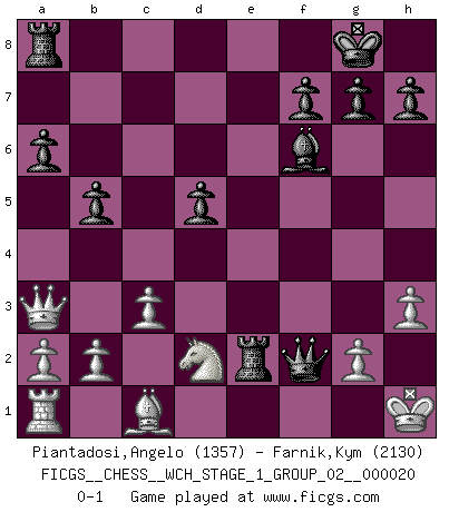Last move : 0-1 2018 December 17 0:30:11 [Event "FICGS__CHESS__WCH_STAGE_1_GROUP_02__000020"] [Site "FICGS"] [Date "2018.11.01"] [Round "1"] [White "Piantadosi,Angelo"] [Black "Farnik,Kym"] [Result "0-1"] [WhiteElo "1357"] [BlackElo "2130"] 1.e4 c5 2.Nf3 d6 3.d4 cxd4 4.Nxd4 Nf6 5.Nc3 a6 6.Be2 e5 7.Nb3 Be7 8.O-O O-O 9.f4 b5 10.Nd5 Bb7 11.Nxf6+ Bxf6 12.c3 Bxe4 13.Bf3 Bxf3 14.Qxf3 Nd7 15.Be3 Nb6 16.Qc6 Nc4 17.Bc1 d5 18.Nd2 Ne3 19.Rf2 Ng4 20.Rf1 Re8 21.fxe5 Nxe5 22.Qc5 Nd3 23.Qa3 Qb6+ 24.Kh1 Nf2+ 25.Rxf2 Qxf2 26.h3 Re2 0-1 Sicilian : Najdorf, Opovcensky variation Kingside Castling by player White (move 8) Kingside Castling by player Black (move 8) Player Black won this chess game. Follow this game move after move (download)I look one move ahead... the best ! (Siegbert Tarrasch) Alles was ich jemals tun will ist Schach spielen. (Robert James Fischer) Por la belleza de sus partidas, la claridad de su juego y lo brillante de sus ideas, Fischer se creó el mismo como un artista de la misma estatura como Brahms, Rembrandt y Shakespeare. (David Levy) L'action d'une oeuvre littéraire se déroule sur un champ de bataille. Les masques et les types du drame moderne correspondent aux pièces du jeu d'échecs. L'intrigue correspond aux coups et aux gambits, c'est à dire aux techniques du jeu telles qu'utilisées et interprétées par les joueurs. Les tactiques et les péripéties [mouvements] correspondent aux coups exécutés par l'adversaire. (Viktor Shklovsky) The hypothalamus is one of the most important parts of the brain, involved in many kinds of motivation, among other functions. The hypothalamus controls the 'Four Fs: Fighting, Fleeing, Feeding and Mating. (Unknown author)