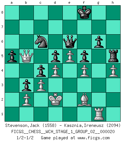 Last move : 1/2-1/2 2019 March 4 9:58:27 [Event "FICGS__CHESS__WCH_STAGE_1_GROUP_02__000020"] [Site "FICGS"] [Date "2018.11.01"] [Round "1"] [White "Stevenson,Jack"] [Black "Kasznia,Ireneusz"] [Result "1/2-1/2"] [WhiteElo "1558"] [BlackElo "2094"] 1.e4 d6 2.d4 g6 3.Nc3 Bg7 4.f4 Nd7 5.Nf3 a6 6.Bc4 e6 7.O-O b5 8.Bd3 c5 9.e5 Bb7 10.Ne4 Bxe4 11.Bxe4 d5 12.Bd3 c4 13.Be2 h5 14.a4 Nh6 15.Bd2 Nf5 16.c3 O-O 17.a5 Ra7 18.Ng5 Qe8 19.Qe1 b4 20.g3 Nb8 21.Kh1 Nc6 22.h3 h4 23.gxh4 Bh6 24.Rg1 Bxg5 25.Rxg5 b3 26.h5 Kg7 27.Bg4 Rh8 28.Bxf5 exf5 29.Qe2 Kf8 30.Kh2 Qe6 31.h4 Rh6 32.Kg2 Ra8 33.hxg6 fxg6 34.Be1 Ra7 35.Kf3 Nd8 36.Qg2 Rg7 37.Ra4 Nc6 38.Ra1 Rh5 39.Bf2 Rxg5 40.Qxg5 Rh7 41.Rh1 Rh5 42.Qg1 Nxa5 43.Qa1 Nc6 44.Qa3+ Kg8 45.Qc5 a5 46.Re1 Rh7 47.Rg1 Kg7 48.Qb6 Kh8 49.Ke3 Kg8 50.Kd2 Kf7 51.Rg5 Rh5 52.Rg1 Kg8 53.Qa6 Qe8 54.Ke1 Qe6 55.Qa8+ Kg7 56.Qb7+ Kg8 57.Kd1 Rh7 58.Qa8+ Kf7 59.Ke2 Kg7 60.Rg5 Rh5 61.Qb7+ Kg8 62.Rg2 Rh7 63.Qa8+ Kg7 64.Rg5 Rh5 65.Qb7+ Kh8 66.Rg2 Kg8 67.Kd2 Kh8 68.Ke3 Rh7 69.Qa6 Kg7 70.Qb7+ Kg8 71.Qa8+ Kg7 72.Rh2 Rh5 73.Qb7+ Kg8 74.Rg2 Qe8 75.Kd2 Rh7 76.Qb5 Qe6 77.Rg1 Kf8 78.Rg5 Rh5 79.Rg1 1/2-1/2 King's pawn Opening Kingside Castling by player White (move 7) Kingside Castling by player Black (move 16) This chess game ended in a draw. Follow this game move after move (download)A big shock; the best chess player in history has passed away. (Lajos Portisch, about Bobby Fischer's death) Er war ein guter Schachspieler, aber ich kann Leute nicht ausstehen, die 'Heil Hitler' rufen (Über Alexander Aljechin). (Miguel Najdorf) Sin errores no puede haber brillantez. (Emanuel Lasker) L'attaque fait le spectacle, la défense gagne les matchs. (Dicton footballistique) The arrogant army will lose certainly the battle. (Chinese proverb)