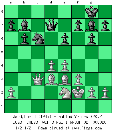 Last move : 1/2-1/2 2019 January 15 4:47:28 [Event "FICGS__CHESS__WCH_STAGE_1_GROUP_02__000020"] [Site "FICGS"] [Date "2018.11.01"] [Round "1"] [White "Ward,David"] [Black "Aahlad,Yeturu"] [Result "1/2-1/2"] [WhiteElo "1947"] [BlackElo "2072"] 1.d4 Nf6 2.c4 g6 3.Nc3 d5 4.cxd5 Nxd5 5.e4 Nxc3 6.bxc3 Bg7 7.Bc4 c5 8.Ne2 O-O 9.O-O Nc6 10.Be3 Na5 11.Bd3 b6 12.Rc1 e6 13.Qd2 Bb7 14.Rfd1 cxd4 15.cxd4 Rc8 16.f3 Qd7 17.Qb4 Rxc1 18.Rxc1 Rc8 19.Rxc8+ Qxc8 20.Qc3 Qd7 21.Kf2 Nc6 22.Bc4 Na5 23.Bd3 Nc6 1/2-1/2 King's Indian defense, 3.Nc3 Kingside Castling by player Black (move 8) Kingside Castling by player White (move 9) This chess game ended in a draw. Follow this game move after move (download)Only the player with the initiative has the right to attack. (Wilhelm Steinitz) Wie gewinnt Tal? Er entwickelt alle seine Figuren in die Brettmitte und opfert sie dann irgendwo. (Robert James Fischer) No volvere nunca a jugar contigo. Has insultado a mi amigo. - cuando un oponente se maldijo por una mala jugada (Miguel Najdorf) Les Echecs ont trois composantes : le temps, l'espace et le matériel en dernier. (Mikhail Tal) You must have a dream in order to have it come true. (A.P.J. Kalam)