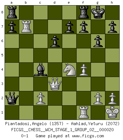 Last move : 0-1 2018 December 19 23:20:4 [Event "FICGS__CHESS__WCH_STAGE_1_GROUP_02__000020"] [Site "FICGS"] [Date "2018.11.01"] [Round "1"] [White "Piantadosi,Angelo"] [Black "Aahlad,Yeturu"] [Result "0-1"] [WhiteElo "1357"] [BlackElo "2072"] 1.e4 c5 2.Nf3 d6 3.d4 cxd4 4.Nxd4 Nf6 5.Nc3 g6 6.Be2 Bg7 7.O-O O-O 8.Be3 Nc6 9.f4 Qb6 10.Qd2 Nxe4 11.Nxe4 Bxd4 12.Bxd4 Nxd4 13.Kh1 Nxe2 14.Qxe2 Qxb2 15.Qd3 Be6 16.Rab1 Qxa2 17.Rxb7 Bc4 0-1 Sicilian : Dragon variation Kingside Castling by player White (move 7) Kingside Castling by player Black (move 7) Player Black won this chess game. Follow this game move after move (download)The Chess pieces are the block alphabet which shapes thoughts; and these thoughts, although making a visual design on the chessboard, express their beauty abstractly, like a poem. (Marcel Duchamp) Karpov ist ein Museumsstück. (Garry Kasparov) La estratégia requiere pensar, la táctica requiere observación. (Max Euwe) On entre au jeu d'Echecs comme on entre en Religion. Pour le joueur d'Echecs, la partie d'Echecs c'est l'office, la messe, le défilé du 1er Mai, le dépôt de gerbe au Monument aux Morts. C'est un drame sacré. (Michel Roos) See no evil, hear no evil, speak no evil. (The 3 monkeys)