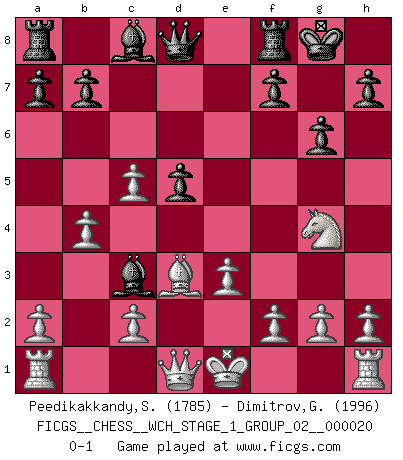 Last move : 0-1 2018 December 8 17:12:9 [Event "FICGS__CHESS__WCH_STAGE_1_GROUP_02__000020"] [Site "FICGS"] [Date "2018.11.01"] [Round "1"] [White "Peedikakkandy,Sameer"] [Black "Dimitrov,George"] [Result "0-1"] [WhiteElo "1785"] [BlackElo "1996"] 1.d4 Nf6 2.Nc3 d5 3.Bf4 g6 4.Nf3 Bg7 5.e3 O-O 6.Bd3 c5 7.dxc5 Nbd7 8.b4 e5 9.Bxe5 Nxe5 10.Nxe5 Ng4 11.Nxg4 Bxc3+ 0-1 Queen's pawn game Kingside Castling by player Black (move 5) Player Black won this chess game. Follow this game move after move (download)My God, Bobby Fischer plays so simply. (Alexei Suetin) Die FIDE ist dabei in die Hände der russischen Mafia zu fallen. (Larry Evans) Por la belleza de sus partidas, la claridad de su juego y lo brillante de sus ideas, Fischer se creó el mismo como un artista de la misma estatura como Brahms, Rembrandt y Shakespeare. (David Levy) Les Echecs, c'est l'art de la guerre sans les charniers, c'est la résurrection des morts tombés au champ d'honneur, l'espoir perpétuel, la suprématie de l'intelligence sur la force, la culture de l'esprit. (F. Szpiner) You can only get smarter by playing a smarter opponent. (Revolver, movie)