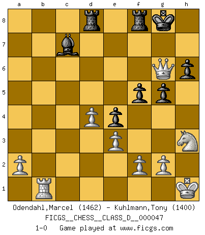 Last move : 1-0 2007 July 5 15:25:56 [Event "FICGS__CHESS__CLASS_D__000047"] [Site "FICGS"] [Date "2007.05.23"] [Round "1"] [White "Odendahl,Marcel"] [Black "Kuhlmann,Tony"] [Result "1-0"] [WhiteElo "1462"] [BlackElo "1400"] 1.c4 f5 2.Nc3 e5 3.d4 e4 4.Nh3 Nf6 5.Bg5 Be7 6.e3 Nc6 7.c5 d6 8.cxd6 Bxd6 9.Bc4 h6 10.Bxf6 Qxf6 11.Nd5 Qf8 12.O-O g5 13.Qb3 Na5 14.Qa4+ Nc6 15.b4 Bd7 16.b5 Ne7 17.Rab1 Nxd5 18.Bxd5 Bxh2+ 19.Kh1 Rd8 20.Qxa7 c6 21.bxc6 bxc6 22.Bxc6 Bxc6 23.Rfc1 Qd6 24.Qa6 O-O 25.Rxc6 Qc7 26.Rxc7 Bxc7 27.Qg6+ 1-0 English : Anglo-Dutch defense Kingside Castling by player White (move 12) Kingside Castling by player Black (move 24) Player White won this chess game. Follow this game move after move (download)Examine moves that smite! A good eye for smites is far more important than a knowledge of strategical principles. (Purdy) Privat ist Kortschnoi kein schlechter Mensch, sehr sympathisch. Aber während des Spiels ist er grausam. Er will dich töten. (Miguel Najdorf) Si tu oponente no puede hacer nada activo, entonces no apures la posición; En vez de eso, dejalo estar sentado ahí, sufriendo y rogandote por un empate. (Jeremy Silman) Toutes les manuvres exécutées sur une colonne ouverte ont pour but ultime l'intrusion définitive sur la septième ou la huitième rangée, en plein cur de la position ennemie. (Aaron Nimzovitch) The greatest con, that he ever pulled... was making you believe... that he is you. (Revolver, movie)