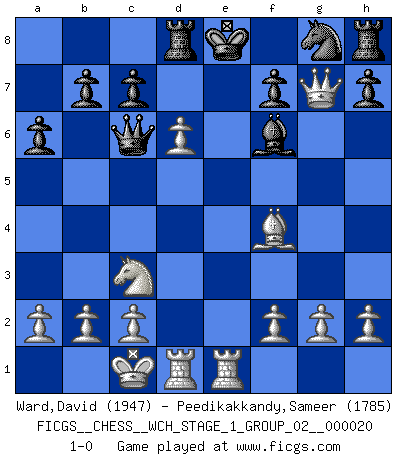 Last move : 1-0 2018 December 9 13:55:41 [Event "FICGS__CHESS__WCH_STAGE_1_GROUP_02__000020"] [Site "FICGS"] [Date "2018.11.01"] [Round "1"] [White "Ward,David"] [Black "Peedikakkandy,Sameer"] [Result "1-0"] [WhiteElo "1947"] [BlackElo "1785"] 1.e4 e5 2.Nf3 Nc6 3.Bb5 d6 4.d4 exd4 5.Nxd4 Bd7 6.Nc3 Nxd4 7.Bxd7+ Qxd7 8.Qxd4 Nf6 9.Bg5 Be7 10.O-O-O a6 11.e5 Ng8 12.Bf4 Qc6 13.exd6 Rd8 14.Qxg7 Bf6 15.Rhe1+ 1-0 Ruy Lopez : Old Steinitz defense Queenside Castling by player White (move 10) Player White won this chess game. Follow this game move after move (download)I like the moment when I break a man's ego. (Bobby Fischer) Unter Putin wird alles Geld aus Russland wie von einem Staubsauger nach Moskau umgeleitet, das ist wie ein schwarzes Loch. (Garry Kasparov) De eso se trata el Ajedrez. Un día le das una lección a tu oponente y al día siguiente el te da una a tí. (Bobby Fischer) La vie est comme un jeu d'échecs : nous esquissons un plan, mais celui-ci est tributaire de ce que daignent faire l'adversaire aux échecs et le destin dans la vie. (Arthur Schopenhauer) The intuitive mind is a sacred gift; the rational mind is a faithful servant. We have created a society that honors the servant but has forgotten the gift. (Albert Einstein)